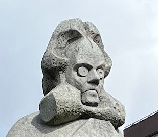 Perhaps it’s fitting that my quest to learn more about this statue didn’t illuminate much about its subject. But if those googly eyes didn’t permit me a view inside, they still reflected something back to me that I didn’t know I needed. Not to overshare, but my mental health has not been great recently, and learning about this statue has brought me some very necessary joy—amplified by the generosity of people who helped me even though I don’t speak their language or even live on the same continent. I can only hope to pay it forward by sharing that joy with you in turn. At the very least, now you know why my phone wallpaper is a guy staring daggers into the distance.